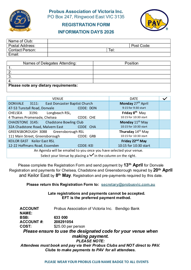 Probus Clubs Meeting Times 2026