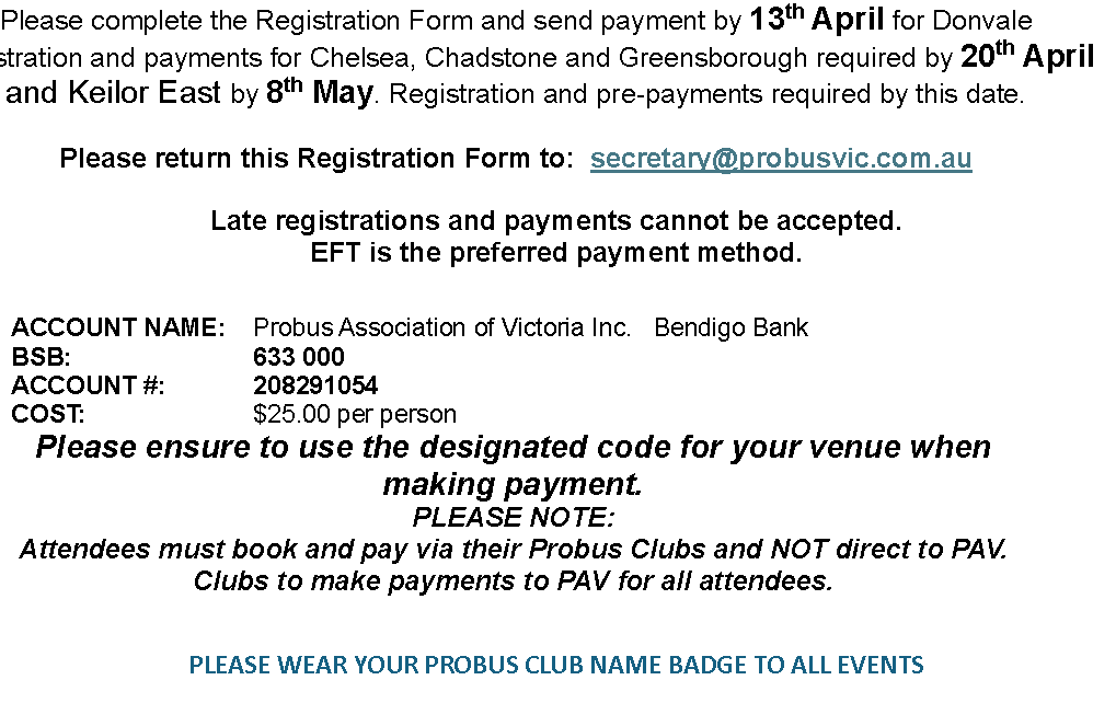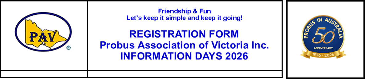 PAV Registration Form – Friendship Day 2026 Please enable JavaScript in your browser to complete this form.Please enable JavaScript in your browser to complete this form. VenuesDonvale 3111: Monday 27th April - East Doncaster Baptist Church 47-53 Tunstall Road. Donvale CODE: DONChelsa 3196: Friday May 8th - Longbeach RSL 4 Thames Promenade. Chelsea - CODE: CHEChadstone 3145: Monday May 11th - Chadstone Bowling Club 32A Chadstone Road. Malvern East - CODE: CHAGreensborough 3088: Thursday 14th May - Greensbourough RSL 111 Main Street. Greensborough - CODE:GRBKeilor East 3033: 22nd May - Keilor East RSL 12-22 Hoffmans Road Essendon - CODE: KEI and Position Name Club Name *Your NameYour Phone Contact NumberEmail *Please advise any Dietry requirementsName of Delegates and Position *Name of Delegates and Position *Name Delegates and Position *Name Delagates and Position *Submit