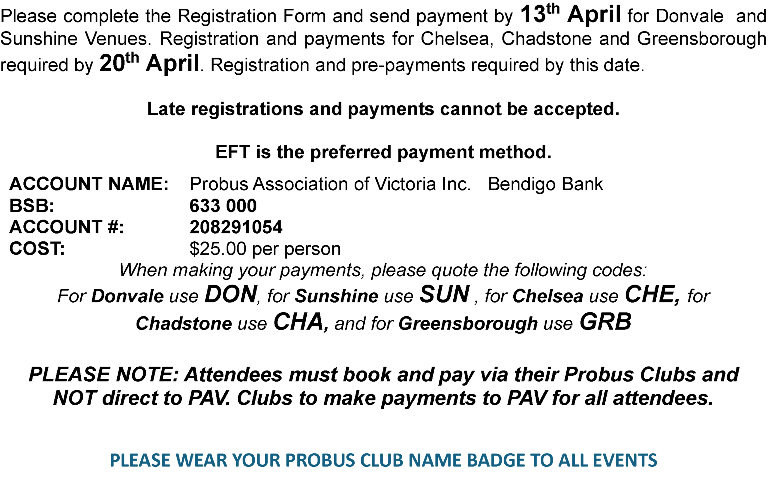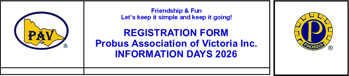 PAV Registration Form – Friendship Day 2026 Please enable JavaScript in your browser to complete this form.Please enable JavaScript in your browser to complete this form. VenuesDonvale Monday 27th April - East Doncaster Baptist Church 47-53 Tunstall Road. DonvaleSunshine Monday 4th May - Sunshine RSL 99 Dickson Street. SunshineChelsa Friday May 8th - Longbeach RSL 4 Thames Promenade. ChelseaChadstone Monday 11th May - Chadstone Bowling Club 32A Chadstone Road. Malvern EastGreensborough Thursday 14th May - Greensbourough RSL 111 Main Street. Greensborough Name requirements Your Club Name *Your NameYour Phone Contact NumberEmail *Please advise any Dietry requirementsName of Delegates and Position *Name of Delegates and Position *Name Delegates and Position *Name Delagates and Position * Submit